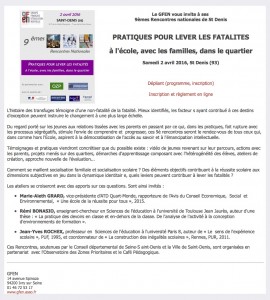 - Éprouver la vie en démocratie à l’école – Dina Borel, Claire Descloux, Jean-Marc Richard, Patricia Riedweg, Rolland Russi – Mairie Salle de la Cité – Comment l’école éduque-t-elle à poser les problèmes et en débattre ? à rechercher les solutions les meilleures pour tous ? à changer les institutions quand elles sont périmées ? à prendre des décisions collectives ? Nous témoignerons dans cet atelier de nos pratiques genevoises du conseil de classe, du conseil d’école, du dialogue philo, exercées pour tenter de faire de ces lieux de paroles de réelles institutions… instituantes. Pour que la jeunesse éprouve la jouissance et la responsabilité d’un citoyen créateur de vie sociale.