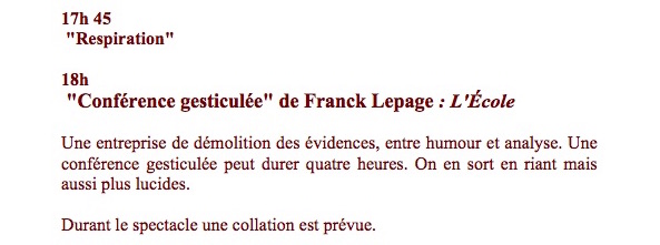Vous ne serez désormais inscrit qu’après avoir reçu confirmation de votre inscription. Etant donné les délais très courts, nous vous demandons de payer sur place désormais. Pour la conférence gesticulée de Franck Lepage, prévoir d’arriver assez tôt. Personne ne pourra entrer dans la salle après le début du spectacle.