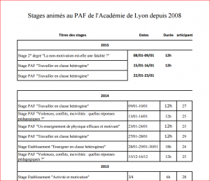 STAGES AU PAF DE LYON Notre Groupe contribue depuis longtemps à la Formation des Enseignants de l’Académie (34 stages depuis 2005). Voir la liste des dernières années; clic sur le tableau ci-dessous